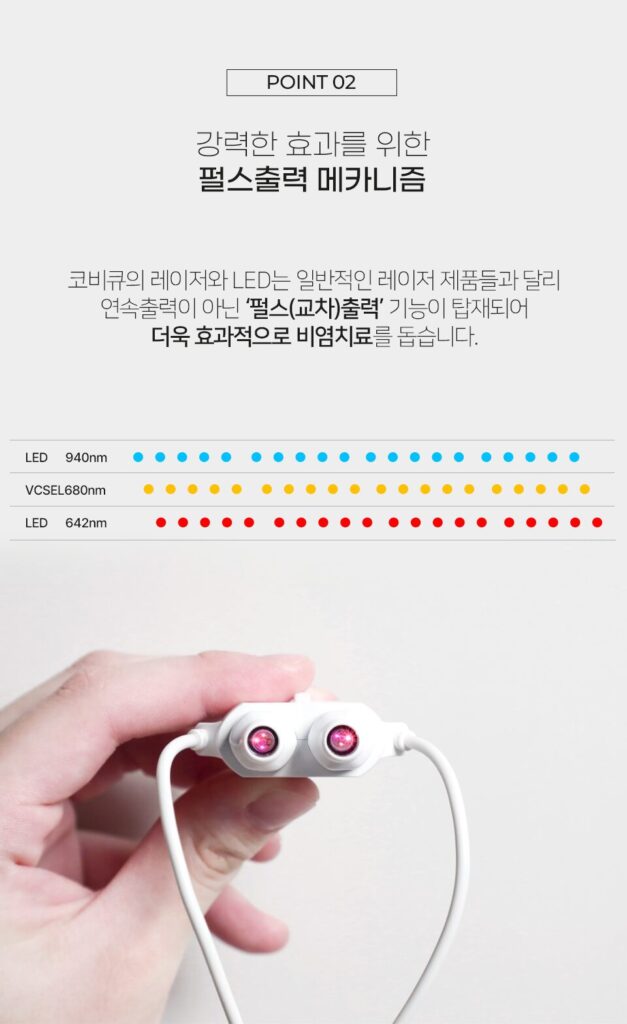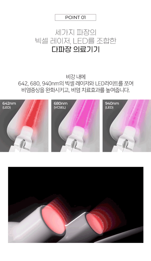 각 파장마다 비강 내 도달하는 깊이와 작용하는 효과가 미세하게 다릅니다. 642, 680, 640mm의 3중 파장은 점막 표면뿐 아니라 심층부까지 에너지를 전달하여 염증과 항체를 더욱 효과적으로 케어하기 위함입니다.