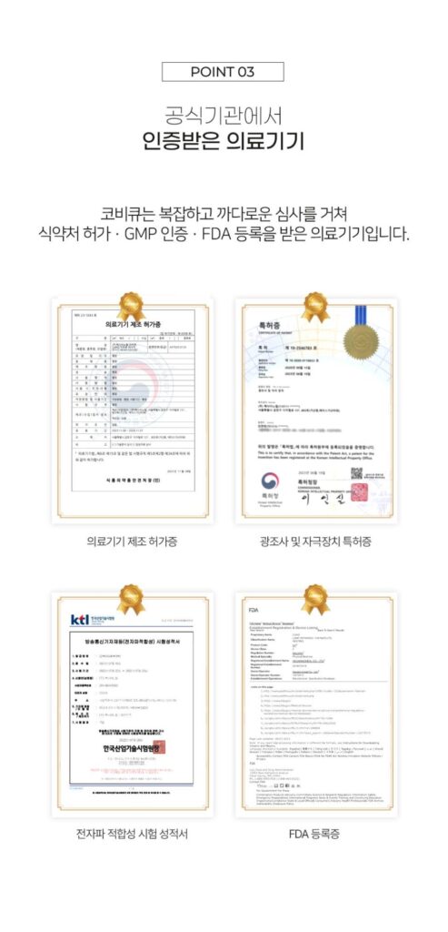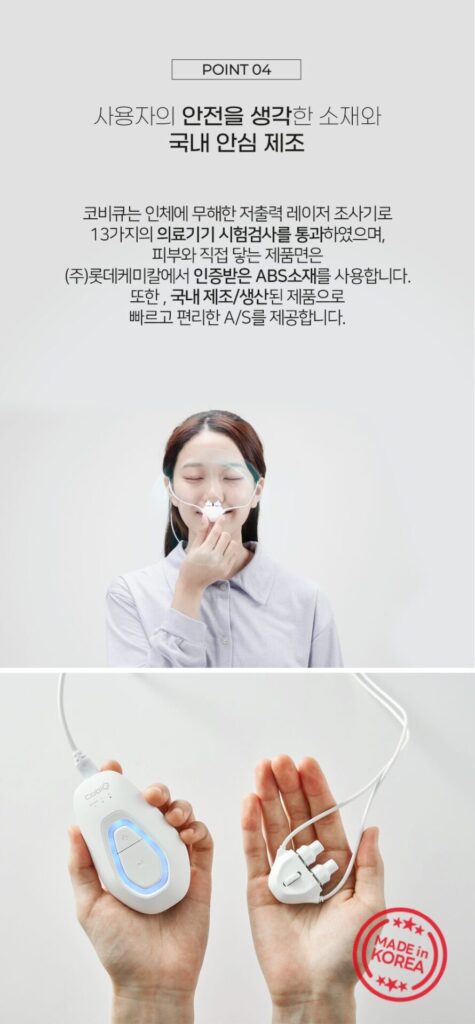 가정용 의료기기라고 해서 다 같은 것은 아닙니다. 코비큐는 엄격한 기준을 통과한 식약처 허가 의료기기이며, 국제적인 공신력을 갖춘 FDA 등록 및 GMP 인증을 완료했습니다. 특히 인체에 무해한 저출력 레이저 방식을 채택하여 남녀노소 누구나 안심하고 사용할 수 있으며, 무려 13가지에 달하는 까다로운 의료기기 시험검사를 모두 통과하여 안정성을 입증받았습니다. 피부와 직접 닿는 코 삽입부는 인증받은 인체 무해 소재인 ABS를 사용하여 장시간 사용에도 자극이 없습니다.