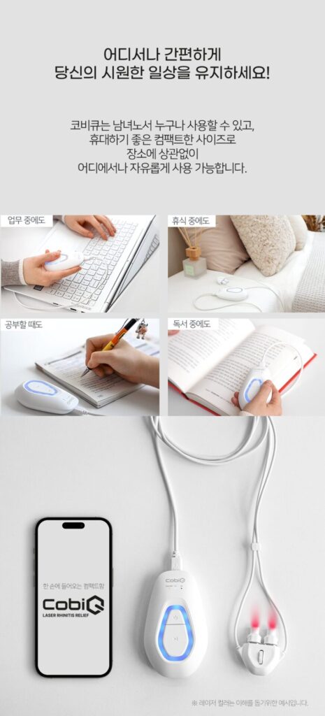 환절기마다 코막힘 때문에 업무에 집중을 못 했는데, 코비큐는 작아서 사무실에서 쓰기 딱 좋아요. 레이저를 쪼이고 나면 코가 한결 가볍고 시원해지는 게 느껴집니다. 디자인도 세련돼서 거부감이 없네요.