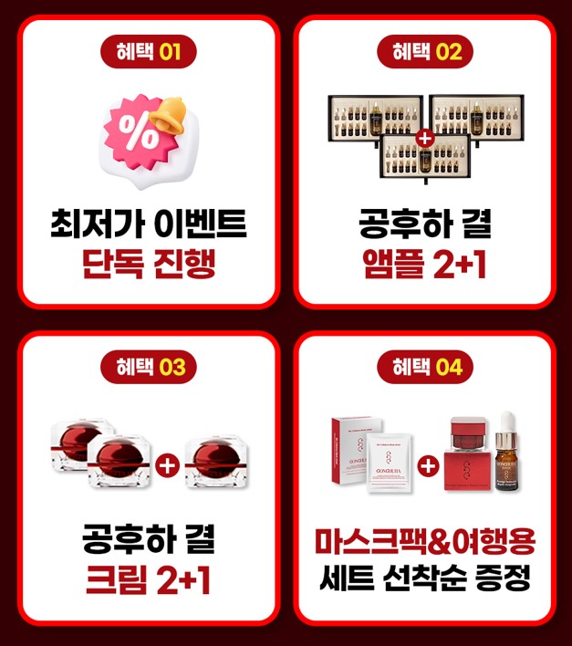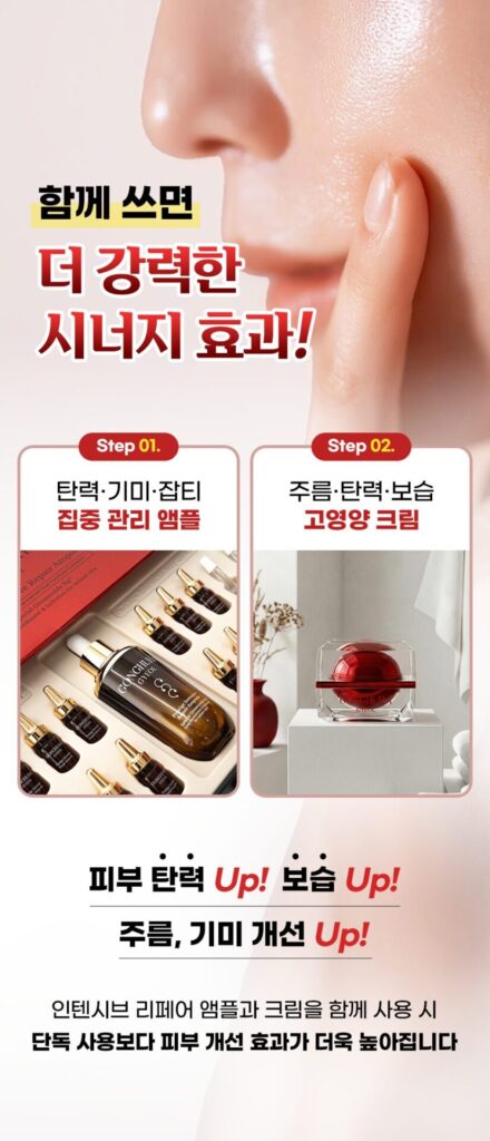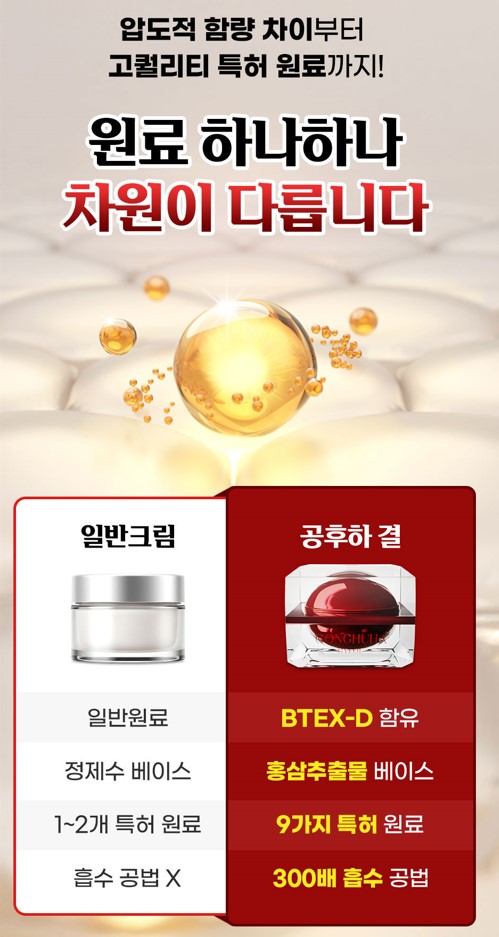 공후하결 리페어 크림은 식약처 인증 미백 및 주름 개선 2중 기능성을 기반으로, 9가지 특허 성분과 첨단 펩타이드를 결합한 올인원 솔루션입니다. 정제수 대신 고농축 홍삼추출물을 베이스로 사용하여 피부 에너지 대사를 극대화했습니다.