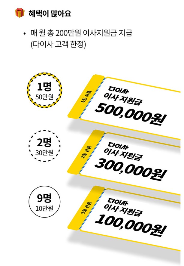 다이사는 이사 고객을 위해 풍성한 프로모션을 진행합니다. 매월 추첨을 통해 **200만 원 이사지원금**을 제공하며, 인터넷 가입 고객에게는 최대 48만 원의 이사지원금 프로모션 혜택을 드리고 있어 실질적인 비용 절감을 돕습니다.