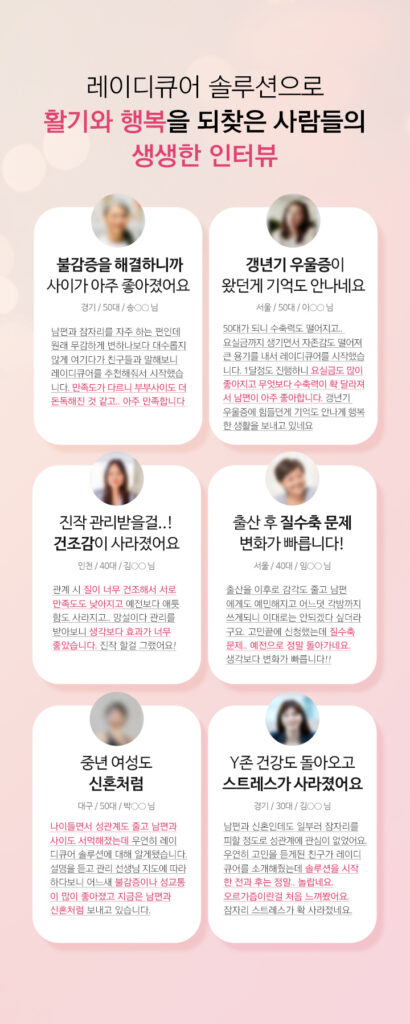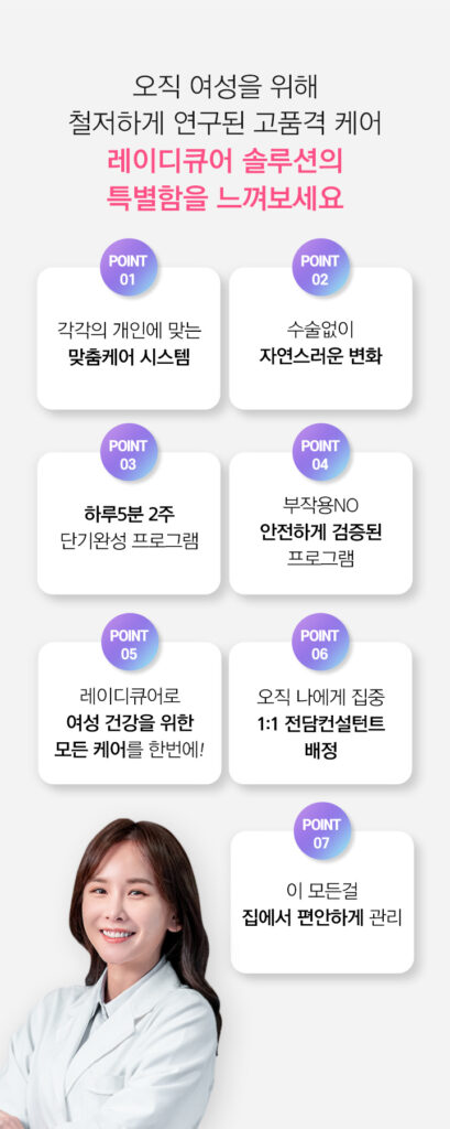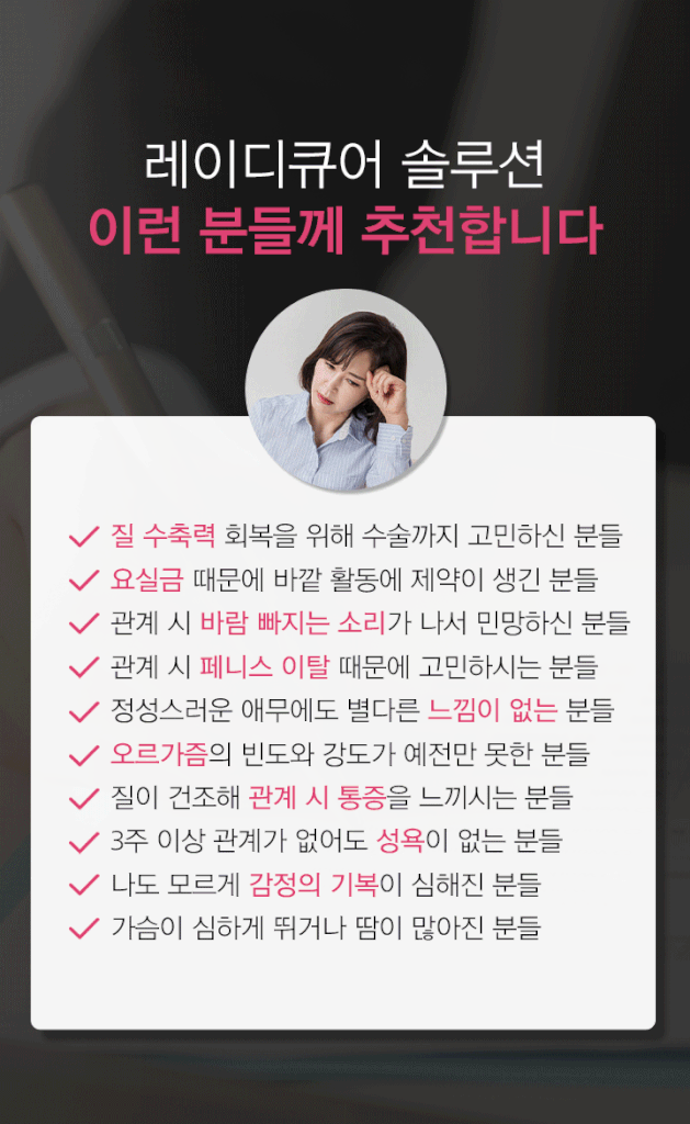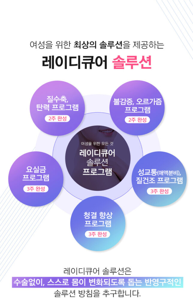 레이디큐어 솔루션은 부끄러운 고민을 확신으로 바꿔드립니다. 전문가와 함께라면 당신의 밤은 다시 뜨거워질 수 있습니다.