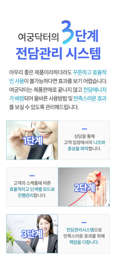 A. 여궁닥터는 음성 가이드 시스템이 탑재되어 있어 기계가 익숙하지 않은 분들도 안내에 따라 쉽게 사용할 수 있습니다. 또한 1:1 매니저가 사용법부터 결과 분석까지 밀착 관리해 드립니다.