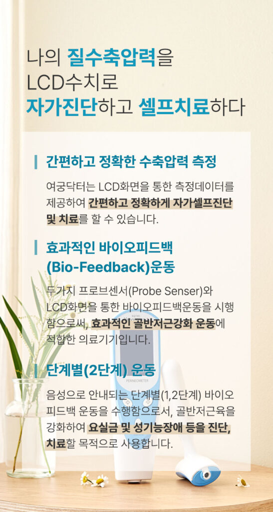 여궁닥터는 질수축 압력을 직접 확인하고 싶은 분, 요실금과 성기능 장애로 일상의 불편함을 겪는 분들에게 가장 과학적이고 프라이빗한 해답을 제시합니다.
