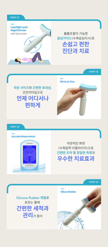 이 기기는 정밀한 진단뿐만 아니라 치료 효과 또한 우수합니다. 전자동 요실금 및 성기능 장애 진단 치료 장치로서 특허를 보유하고 있으며, 볼륨 조절이 가능한 음성 가이드 시스템을 탑재하여 누구나 쉽고 편하게 자가 치료를 진행할 수 있습니다. 위생적인 Silicone Rubber 재질을 사용하여 세척과 관리가 간편하며, 건전지 타입의 컴팩트한 사이즈로 언제 어디서나 장소 구애 없이 관리가 가능합니다.