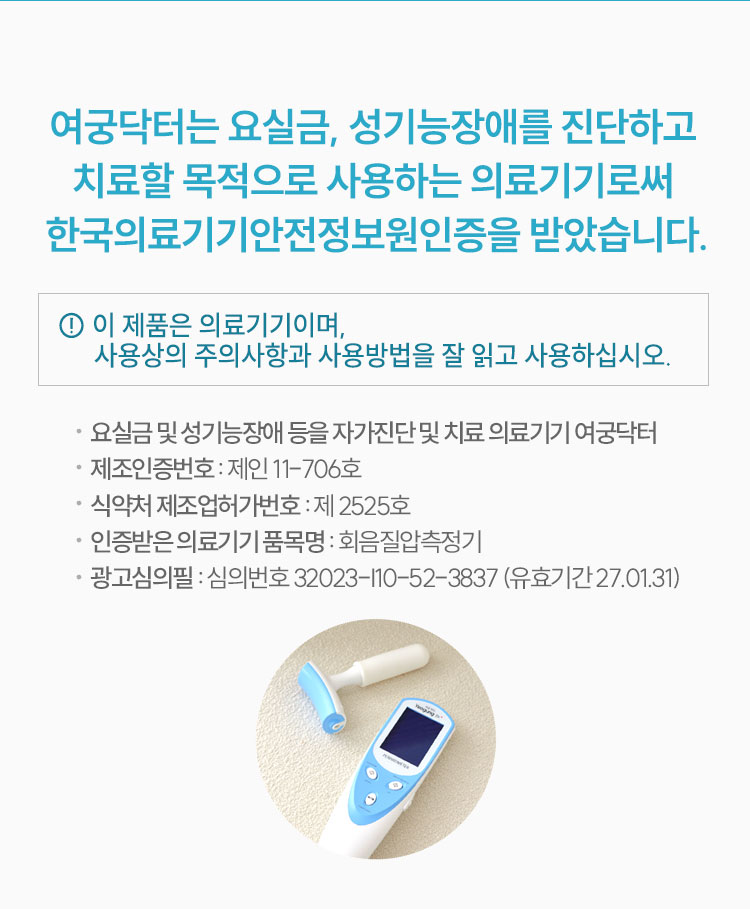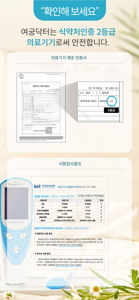여궁닥터의 핵심 가치는 '정밀한 데이터'에 있습니다. 단순히 감각에 의존하는 케어가 아니라, 식약처에서 요실금 및 성기능 장애의 진단과 치료 목적으로 정식 품목 허가를 받은 2등급 의료기기입니다. 본인의 질 수축 압력을 실시간으로 측정하여 LCD 화면을 통해 데이터로 직접 확인할 수 있기 때문에, 현재 본인의 상태를 정밀하게 진단하고 치료 과정에서 나타나는 변화를 수치로 체감할 수 있습니다.