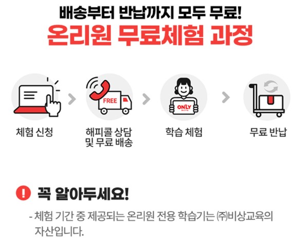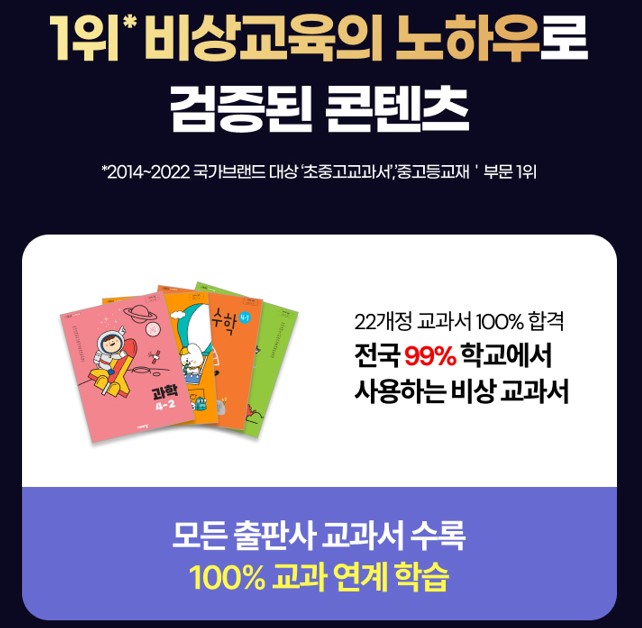 백문이 불여일견입니다. 비상교육은 제품력에 대한 자신감으로 10일간의 무료체험 기회를 드립니다. 전용 학습기 무료 대여는 기본, 체험 후 로그인만 해도 스타벅스 아메리카노 기프티콘을 100% 지급합니다. 또한 학습 전문가들이 집필한 메타인지 안내서까지 무료로 받아보실 수 있는 이번 기회를 절대 놓치지 마십시오. (이곳에 5,000자 분량의 구체적인 학습법과 과목별 특장점을 상세히 서술하여 정보 신뢰도를 극대화하십시오.)