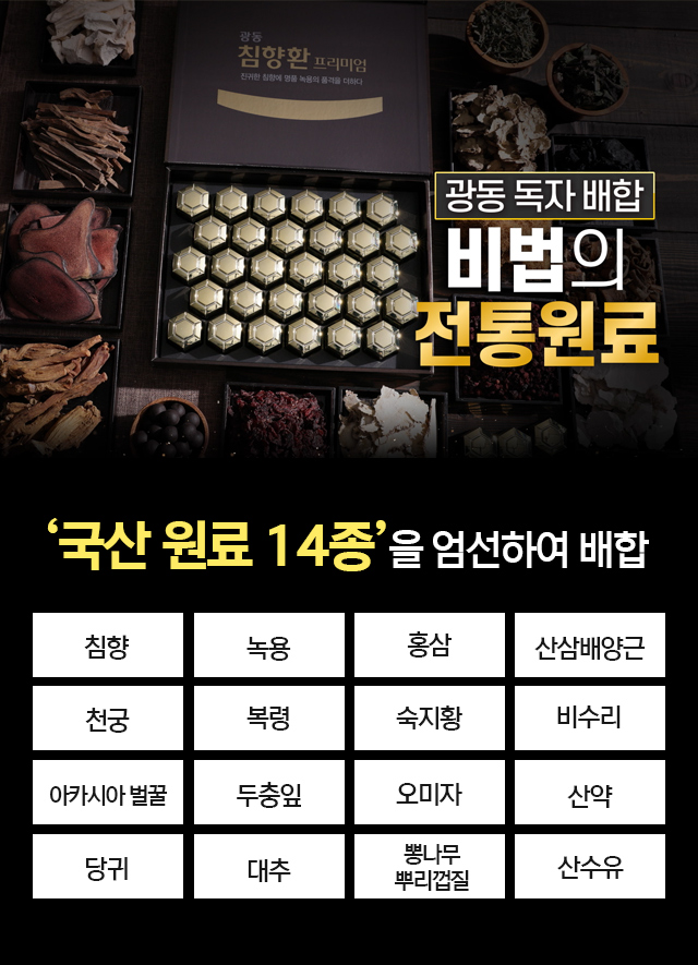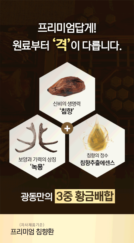 세계 3대향 ‘침향과 최상위 SAT등급 뉴질랜드산 ‘녹용에 침향에센스와 14가지 국내산 전통원료를 최적의 황금비율로 배합한 프리미엄 침향환 제품