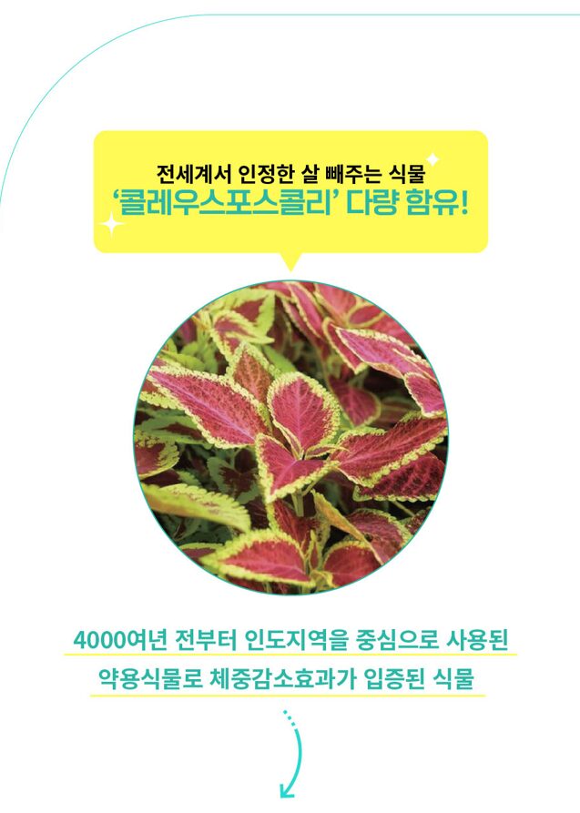 전세계에서 인정한 , 식약처인증 콜레우스포스콜리 추출물 다량함유 (4000년 정도 전부터 인도지역을 중심으로 사용된 약용식물로 체중감소가 입증)