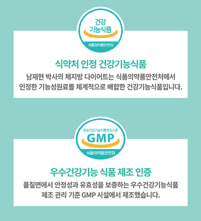 식약처 인증 건강기능식품, 남재현 다이어트의 모든 제품은 식약처에서 인증한 기능인증원료를 사용한 믿을 수 있는 제품입니다.
