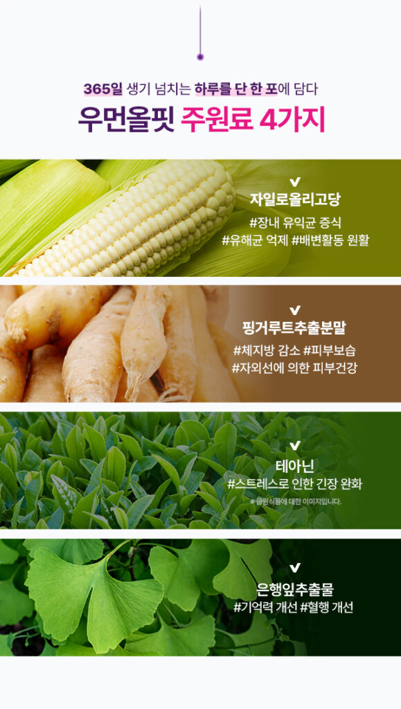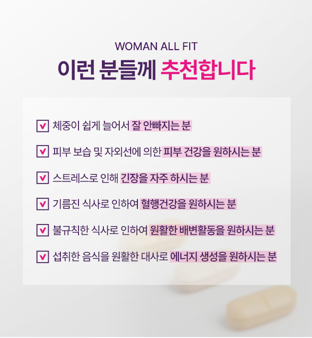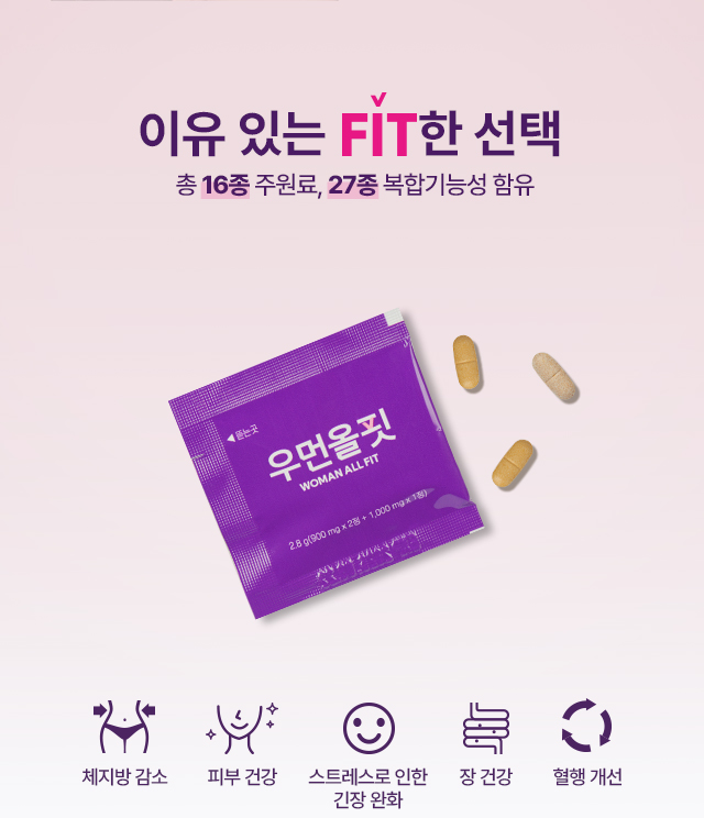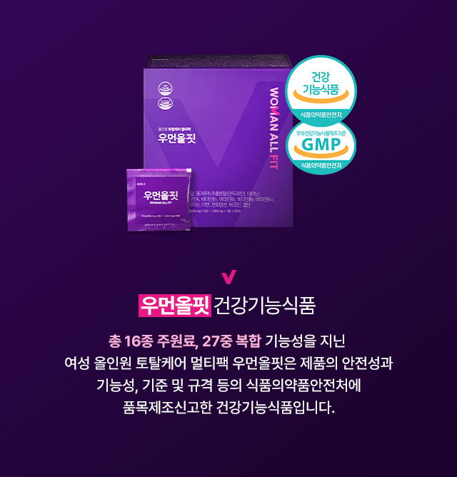 우먼올핏은 여성의 다양한 고민을 한 번에 관리할 수 있도록 과학적으로 설계된 여성 맞춤 건강기능식품입니다.
