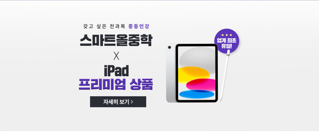 스마트올중학은 아이패드+애플펜슬 패키지를 업계 최초로 도입했습니다.