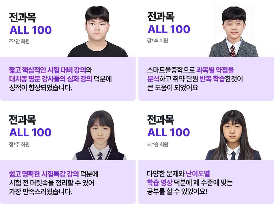 지방에서도 대치동 정점에 있는 강의를 들을 수 있습니다. 수학의 '깊은생각', 영어의 'ILE'와 '함영원 영어학원', 과학·특목 입시의 '미래탐구' 등 대치동을 주름잡는 TOP8 학원의 강의가 웅진 스마트올 중등에 단독 입점해 있습니다. 현직 강사진의 노하우와 전용 교재를 그대로 사용하여, 집에서도 최상위권의 공부법을 익히고 실력을 업그레이드할 수 있습니다.