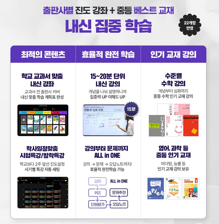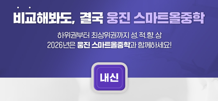 웅진 스마트올 중등의 내신 진도는 하루 학습 분량을 최소화하여 누적 학습 효과를 극대화하는 데 초점을 맞춥니다. 20분 강의 안에 '개념 강의 - 확인 퀴즈 - 단원 평가'까지 한 번에 연결되는 올인원 시스템을 구축하여, 별도의 문제집 없이도 완벽한 교과서 진도 대응이 가능합니다. 방학 기간에는 수준별 맞춤 특강을 통해 다음 학기 기초를 탄탄히 다질 수 있는 전략적 로드맵을 제공합니다.