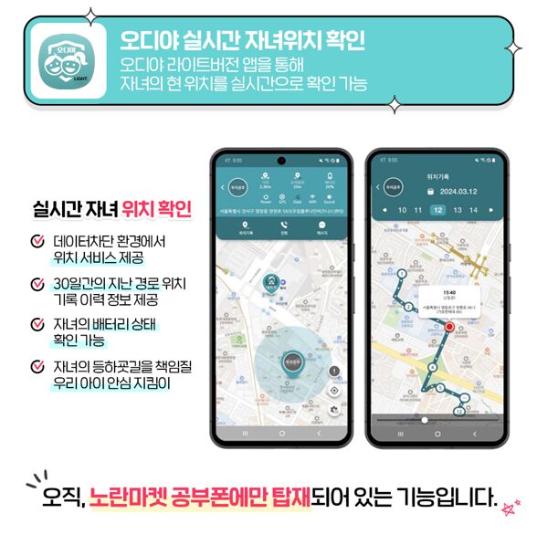 노란마켓 공부폰은 ‘오디야’ 라는 자체 개발 앱을 통해 실시간 아이위치확인이 가능합니다. 국내 최초이며 유일한 서비스입니다. 자녀의 현재 위치 확인, 과거 이동 경로, 배터리 잔량 실시간 체크까지 가능해 부모님들의 걱정을 덜어줍니다. 기종은 갤럭시 A16으로 데이터부터 와이파이, 핫스팟까지 완전 차단된 휴대폰입니다. 영한사전, 학습시간통계 등 다양한 학습 어플들을 통해 학습 능력 및 집중력 향상을 보조합니다.